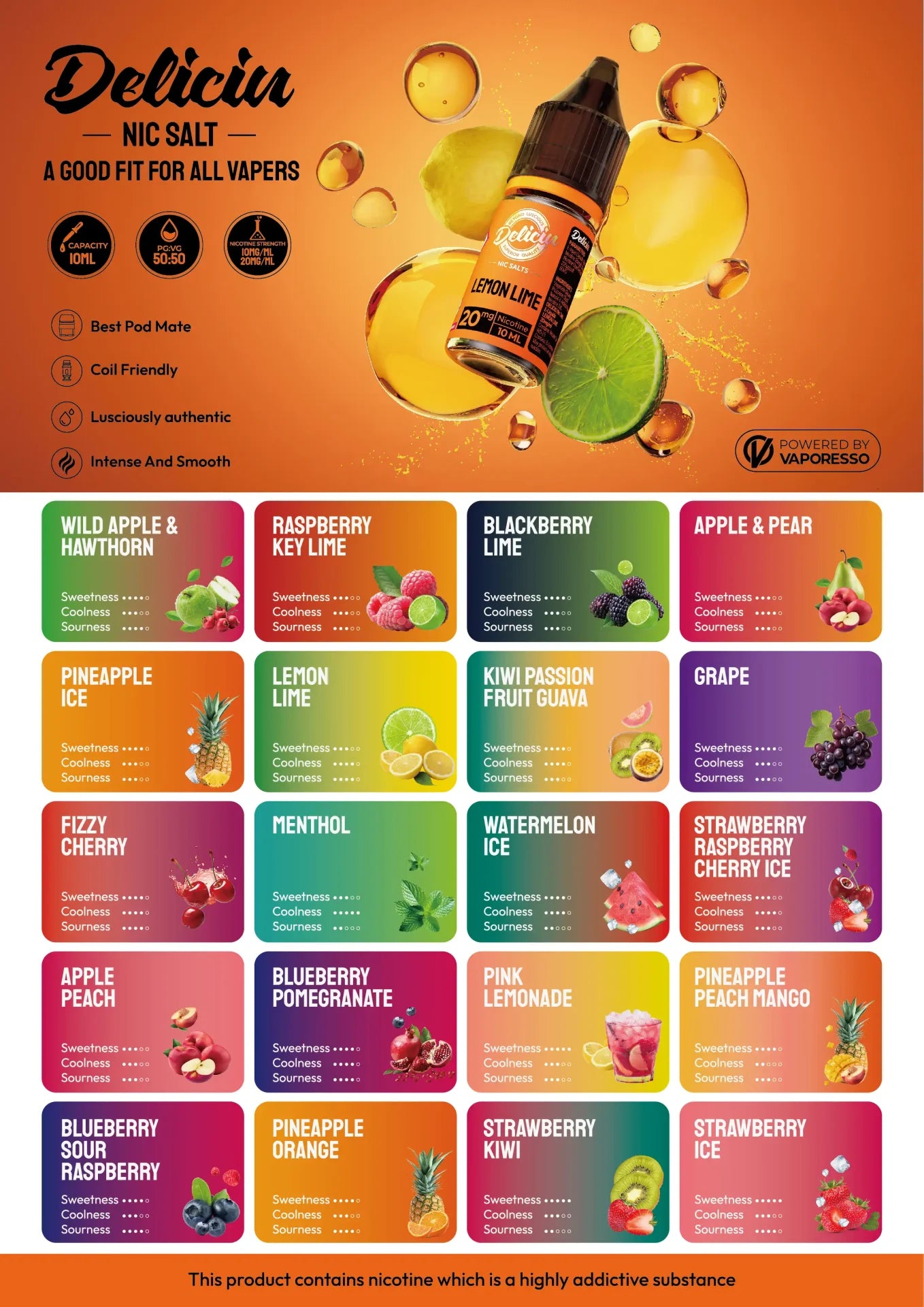 Deliciu nic salt e-liquids are available in a range of punchy fruit, soda and ice flavours, there’s plenty of blends that’ll suit most tastes. Each mix contains salt nicotine so they’re perfect if you’re looking for something that satisfies cravings quickly whilst providing a smooth throat hit. Since these vape juices have been crafted with 50% VG, they’re best used in an MTL (Mouth To Lung) kit, like the ones made by Vaporesso.